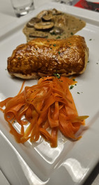 Pouletbrust im Teig, Pilzragout und Rüebli